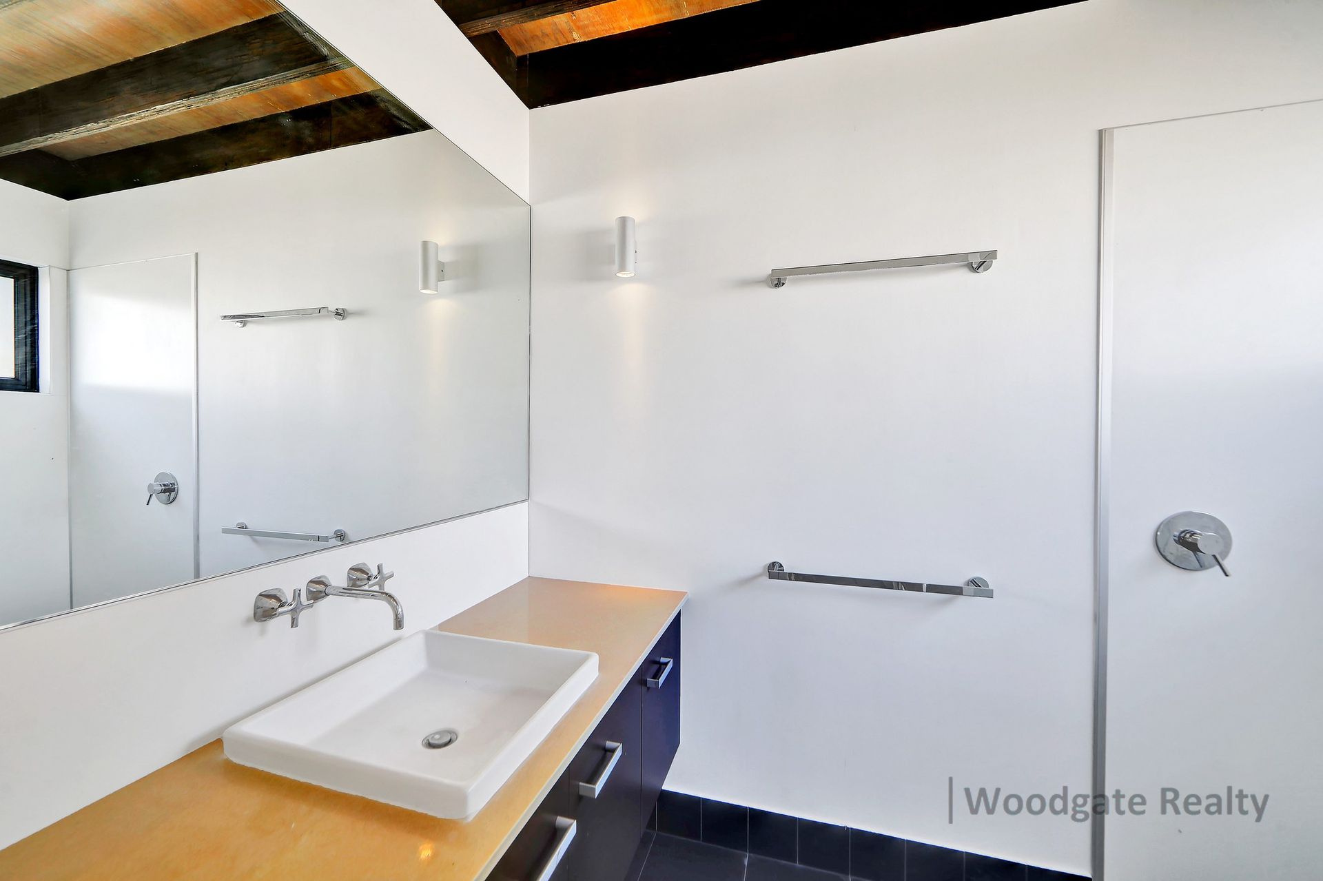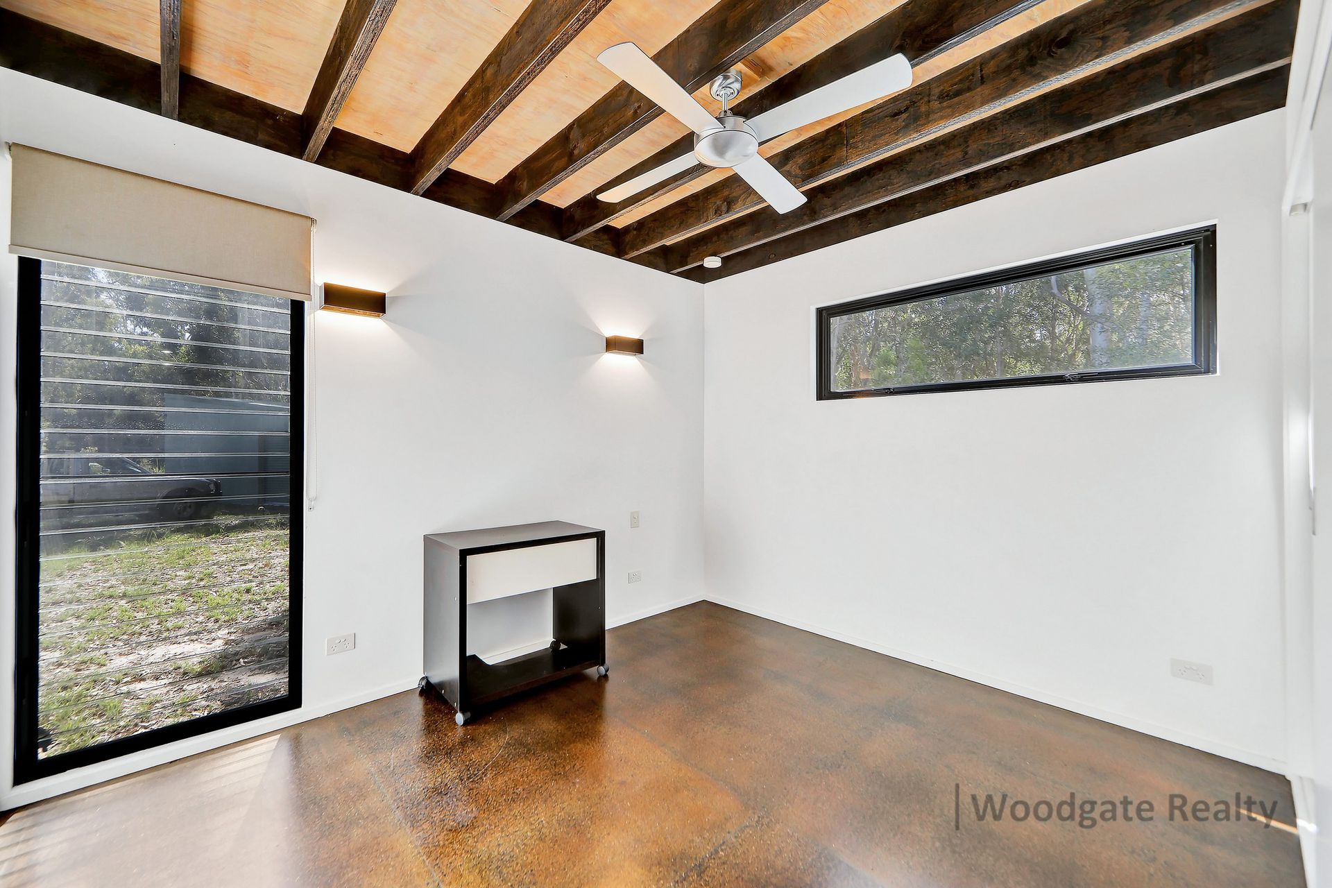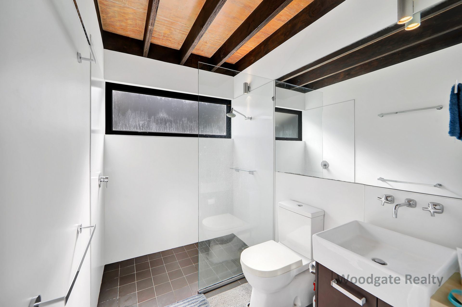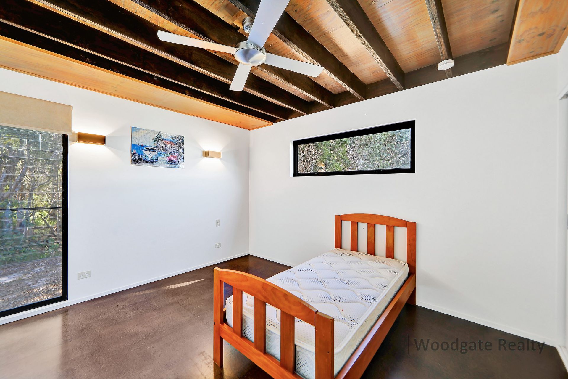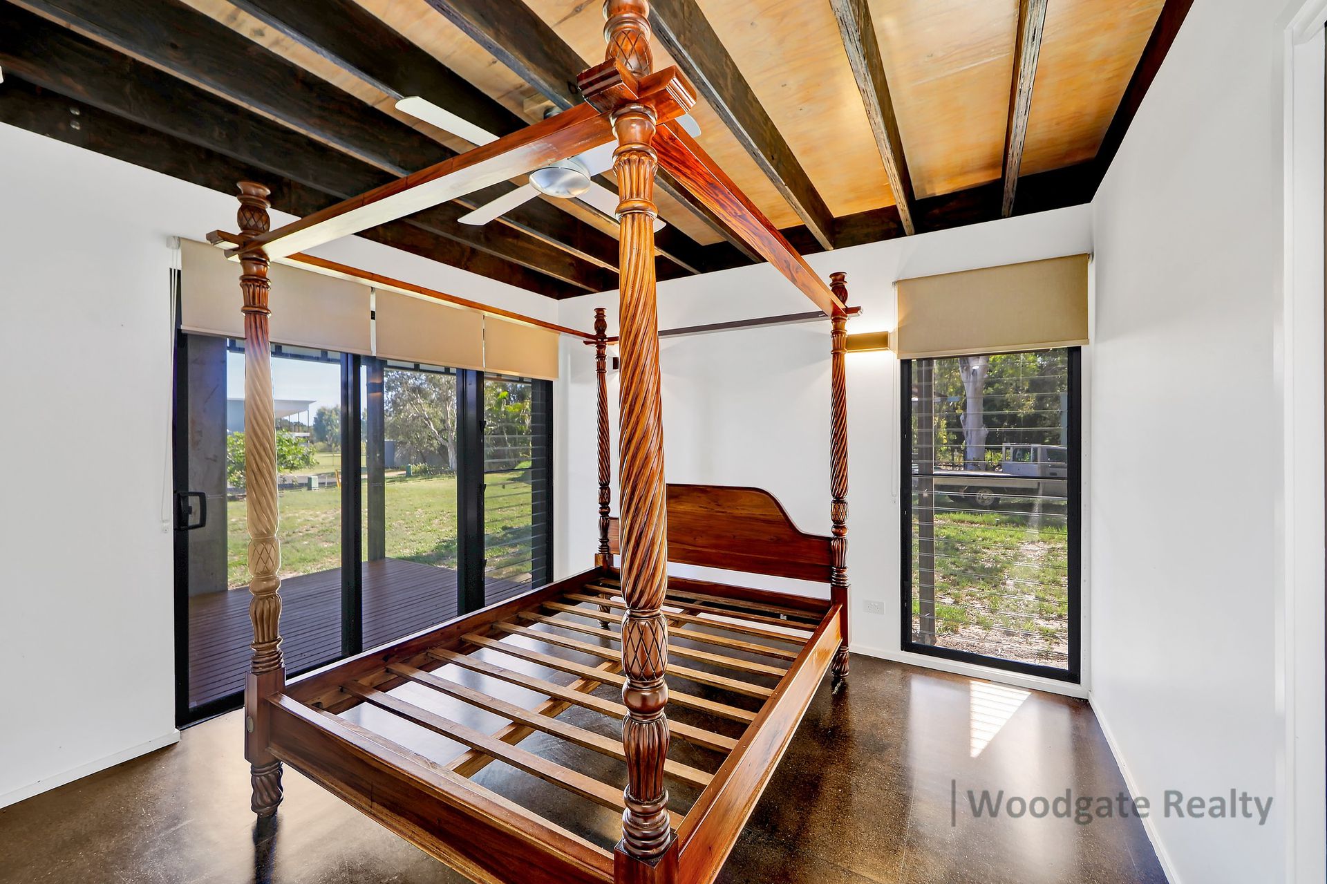 - Three generous queen-sized bedrooms with extra-high exposed timber ceilings